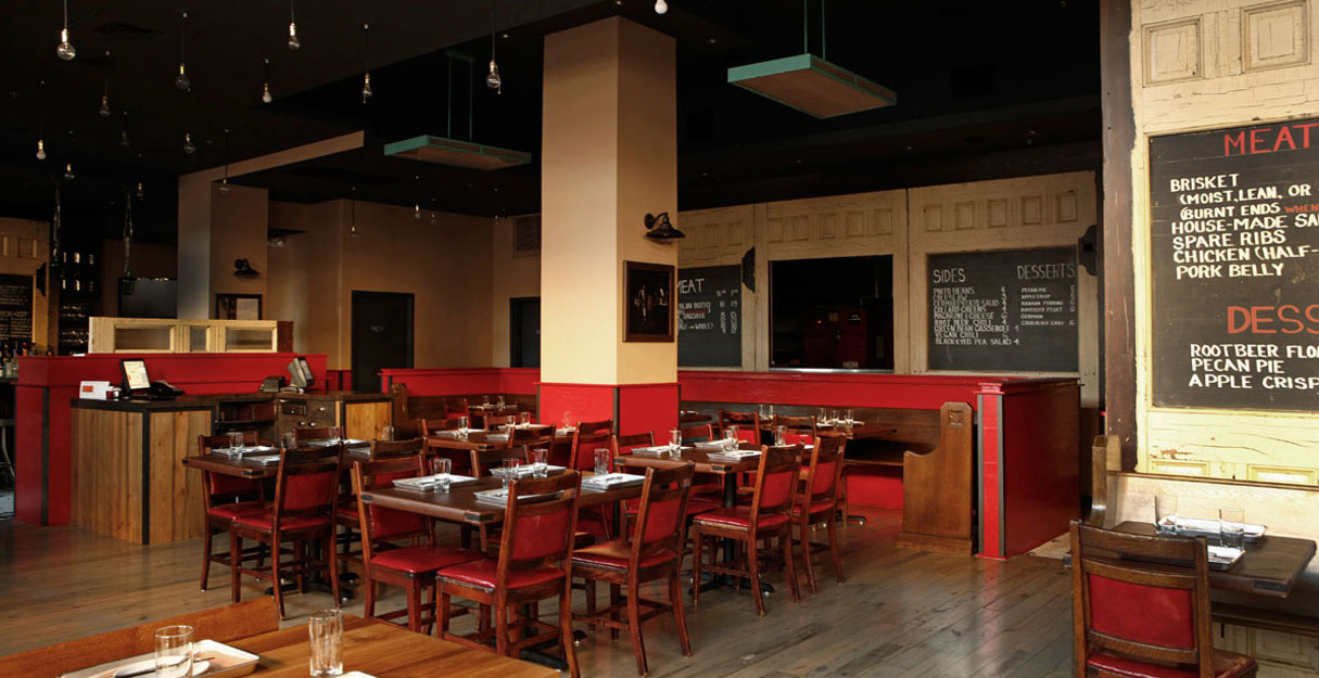 Her frontier-influenced design focuses on the fire engine red smokers, visible through a window in the dining room and bar area. The restaurant features light wood floors, weathered red paint, a working jukebox and custom “blackboard walls,” large panels of schoolhouse blackboards that can be rearranged to create private dining areas throughout the 80-seat space.